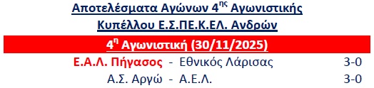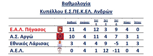 Στο άλλο παιχνίδι η Αργώ επικράτησε της ΑΕΛ και βρίσκεται στη δεύτερη θέση της βαθμολογίας. Ήδη έχουν ξεχωρίσει οι ομάδες που θα βρεθούν αντιμέτωπες στον τελικό της 20ης Δεκεμβρίου.